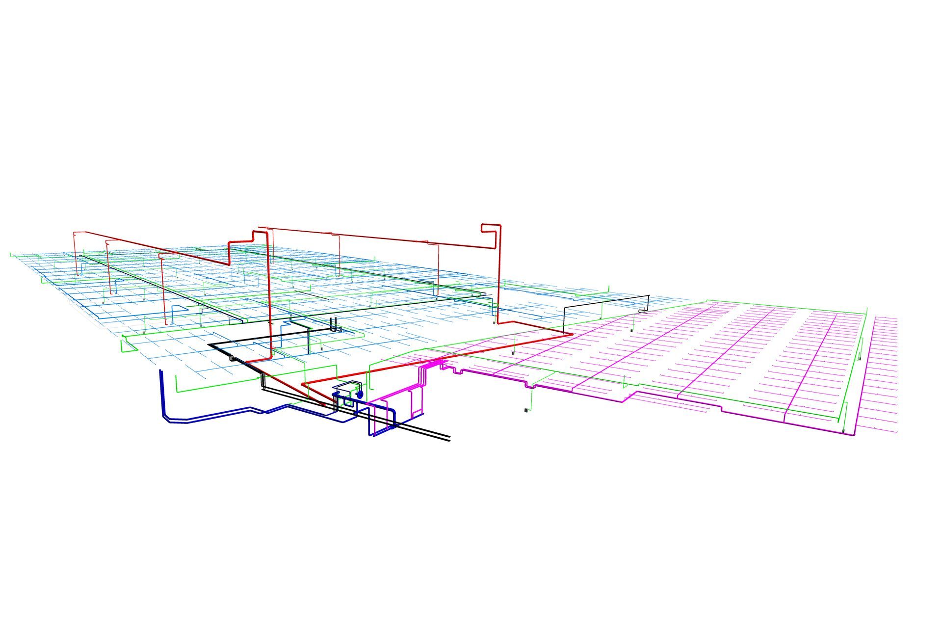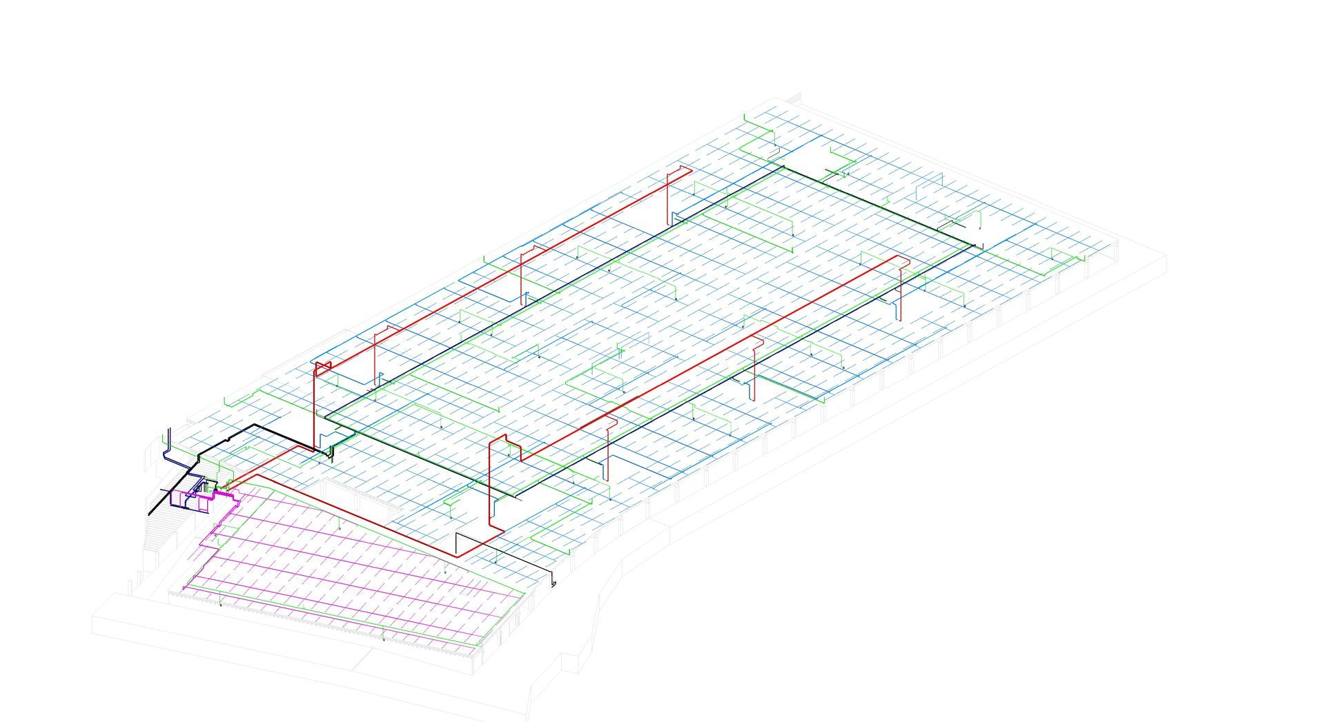 Rilievo e restituzione in BIM dell'impianto di spegnimento sprinkler ed idranti a servizio del piano zero dell'edificio Ex Mercato dei Fiori. Superficie totale: 28.000 m².